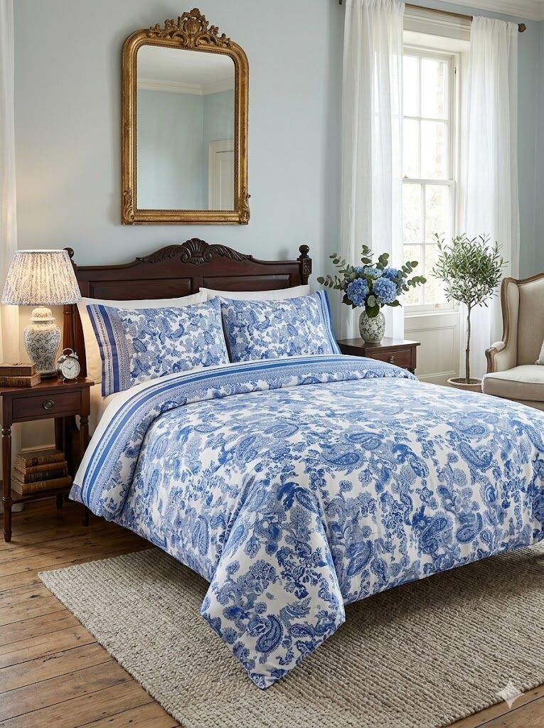 Completo lenzuola matrimoniale in percalle di cotone stampato.