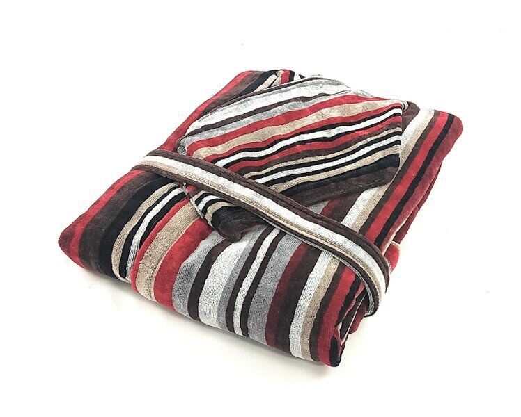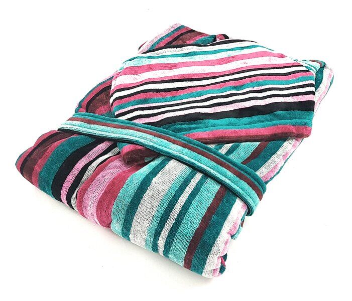 Scopri l'accappatoio gessato con cappuccio in spugna di cotone, disponibile nel colore Nocciola. Perfetto per un comfort assoluto dopo la doccia o il bagno.
